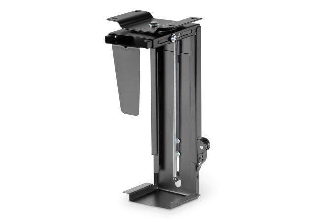 A DIGITUS® univerzális PC-tartója az asztallap alá szerelhető. 30-51 cm magas és 8,8-20,3 cm széles PC-házakhoz alkalmas. A ház mélysége nincs korlátozva, amíg a maximális teherbírás nem haladja meg a 10 kg-ot. A kívánt magasság és szélesség egyszerű rögzítésére szolgáló fogantyú lehetővé teszi a PC-ház fokozatmentes beállítását – szerszámok nélkül. A teljes tartó 360°-ban elforgatható, például a hátoldalon található csatlakozókhoz való hozzáférés megkönnyítése érdekében. A PC magasan a talaj felett helyezkedik el, hogy megakadályozza a por és a szennyeződés felhalmozódását, így könnyebben tisztítható az asztal alatt. Praktikus, sokoldalú megoldás számos elterjedt számítógépházhoz.