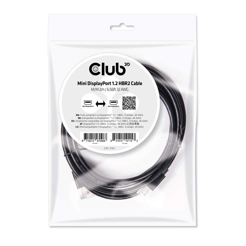 CAC-2161 - The Club 3D Mini DisplayPort™ cable enables the connection of your Mini DisplayPort™ supported (Gaming) PC or Laptop to an Ultra High Resolution Monitor or other Mini DisplayPort™ supported device. The Club 3D CAC-2161 is fully compatible to DisplayPort™ 1.2 specifications and is downwards compatible to earlier versions. The soft UltraFlex jacket protects the c