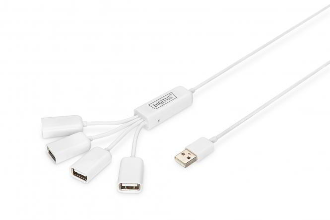 USB 2.0 kábelelosztó, 4 portos, 4x USB A/F, 1x USB A apa, DC2.5mm (tápegység nem tartozék)