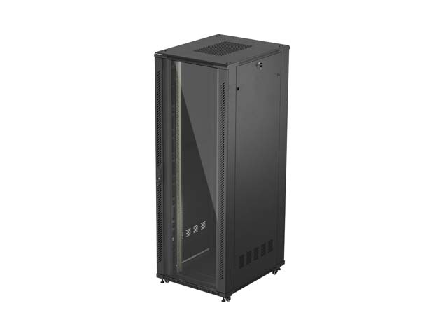 Elülső zár, Lábak, M6-os csavarok, Hátsó zár, Oldalsó zárak, Szellőzőpanel (6 ventilátor), Függőleges kábelrendező panel x2, Fékezhető kerekek